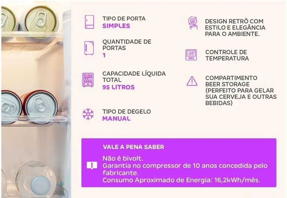 Destaque em qualquer ambiente, o Frigobar Retrô 95 Litros une design vintage, baixo consumo de energia e ótima capacidade interna.