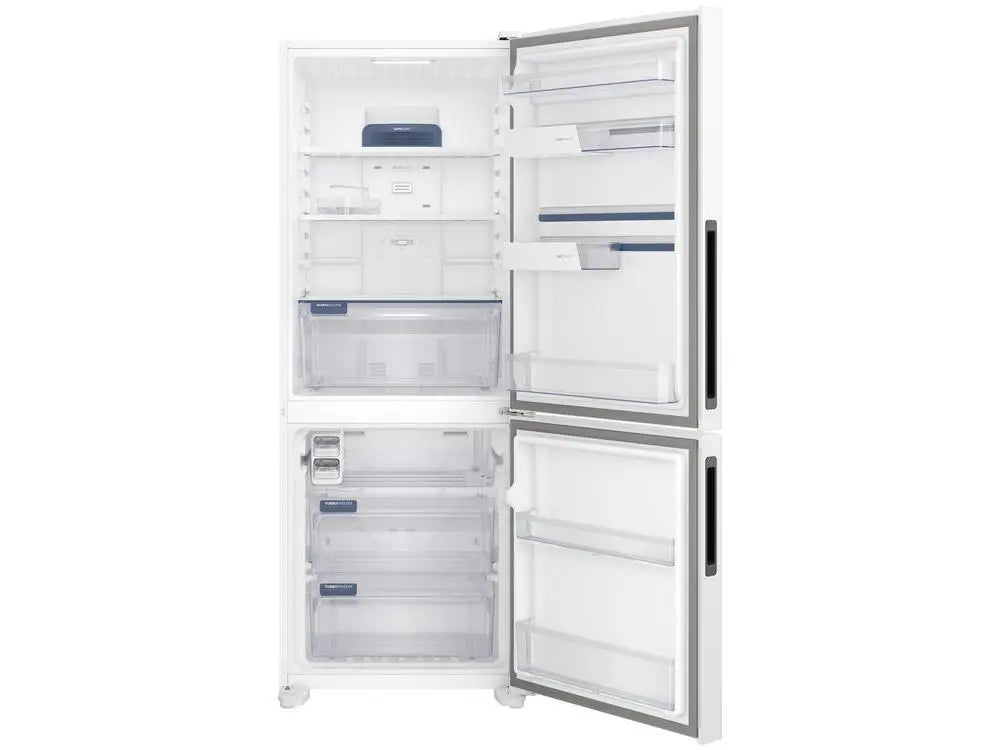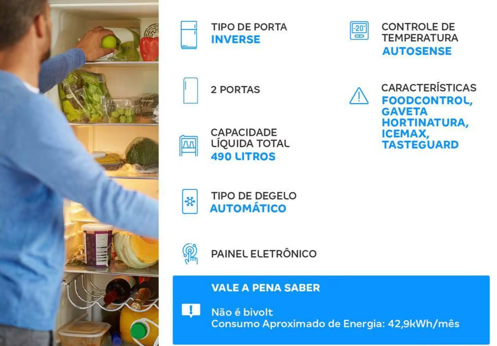 Se você está montando ou reformando sua cozinha, precisa de eletrodomésticos que além de oferecer qualidade e tecnologia, ajudam a compor a decoração do ambiente. A Electrolux oferece a geladeira/refrigerador na cor branca. Com degelo automático, ela tem porta inverse e capacidade líquida total de 490L. E ainda, conta com várias tecnologia como AutoSense, que controla a temperatura automaticamente usando Inteligência Artificial e prolongando a vida dos alimentos por até 30% mais tempo. É uma tecnologia exclusiva Electrolux, que reconhece as suas rotinas, identificando os momentos de maior uso e de abertura de portas, ficando automaticamente mais fria. Ou reconhece os momentos de menor uso (durante a noite ou férias, por exemplo) e estabiliza a temperatura, além de reduzir possíveis ruídos. Tecnologia Inverter: Uma das geladeiras brasileiras mais econômicas do segmento, com até 42% de economia de energia e preservação ideal dos alimentos. FoodControl: Ajuda a controlar a validade de alimentos frescos até a data ideal de consumo, evitando desperdícios. Gaveta HortiNatura: Preserva o frescor de frutas e vegetais por até 2x4 mais tempo. IceMax: Compartimento com abertura exclusiva que permite a reposição da água sem respingos, que não mistura odores com o restante do freezer e é fácil de remover. TasteGuard: Elimina até 9x5 mais rápido os maus odores causados por bactérias, garantindo que sua geladeira permaneça sempre fresca e higiênica. E Porta-ovos: Com capacidade para 12 ovos para mais comodidade na organização.