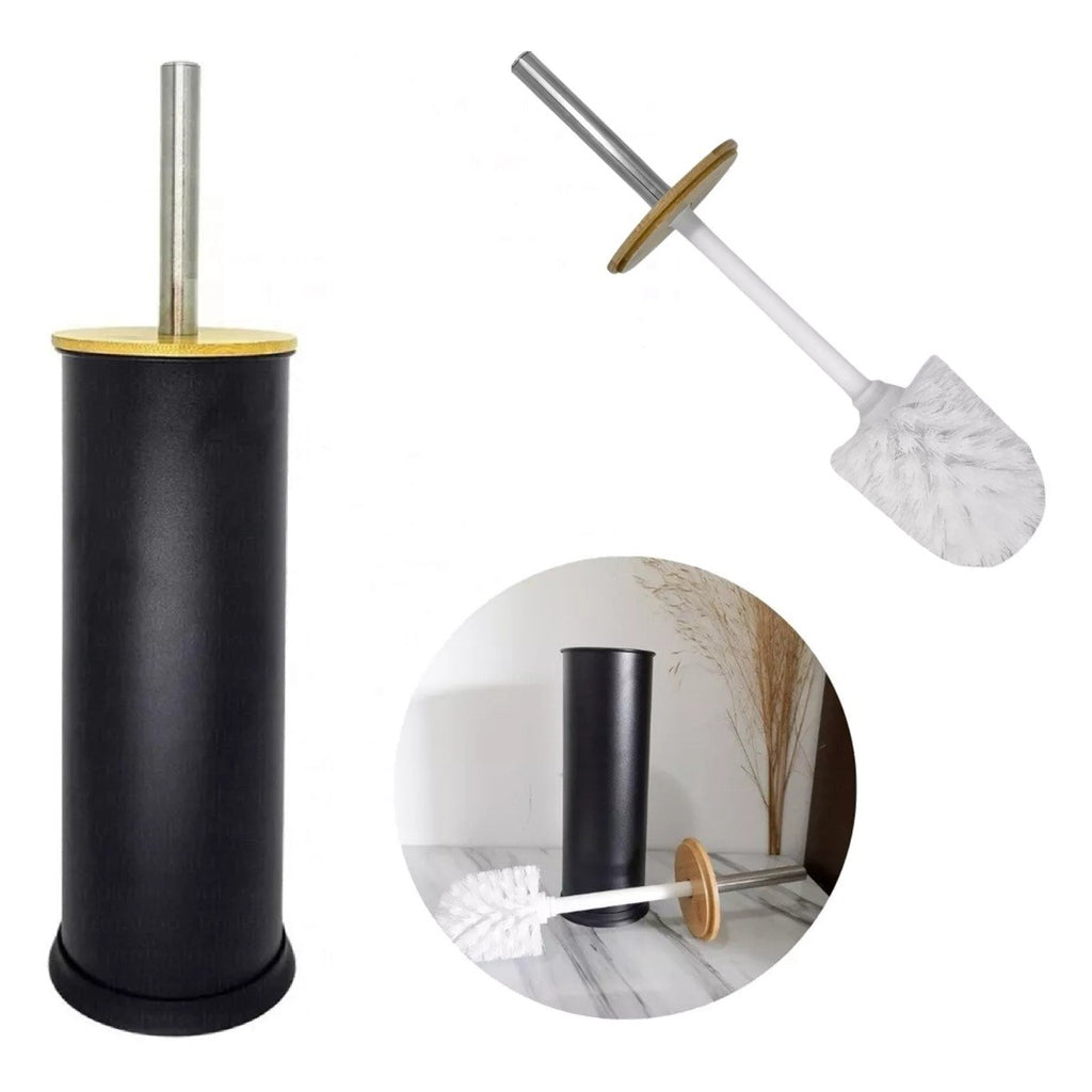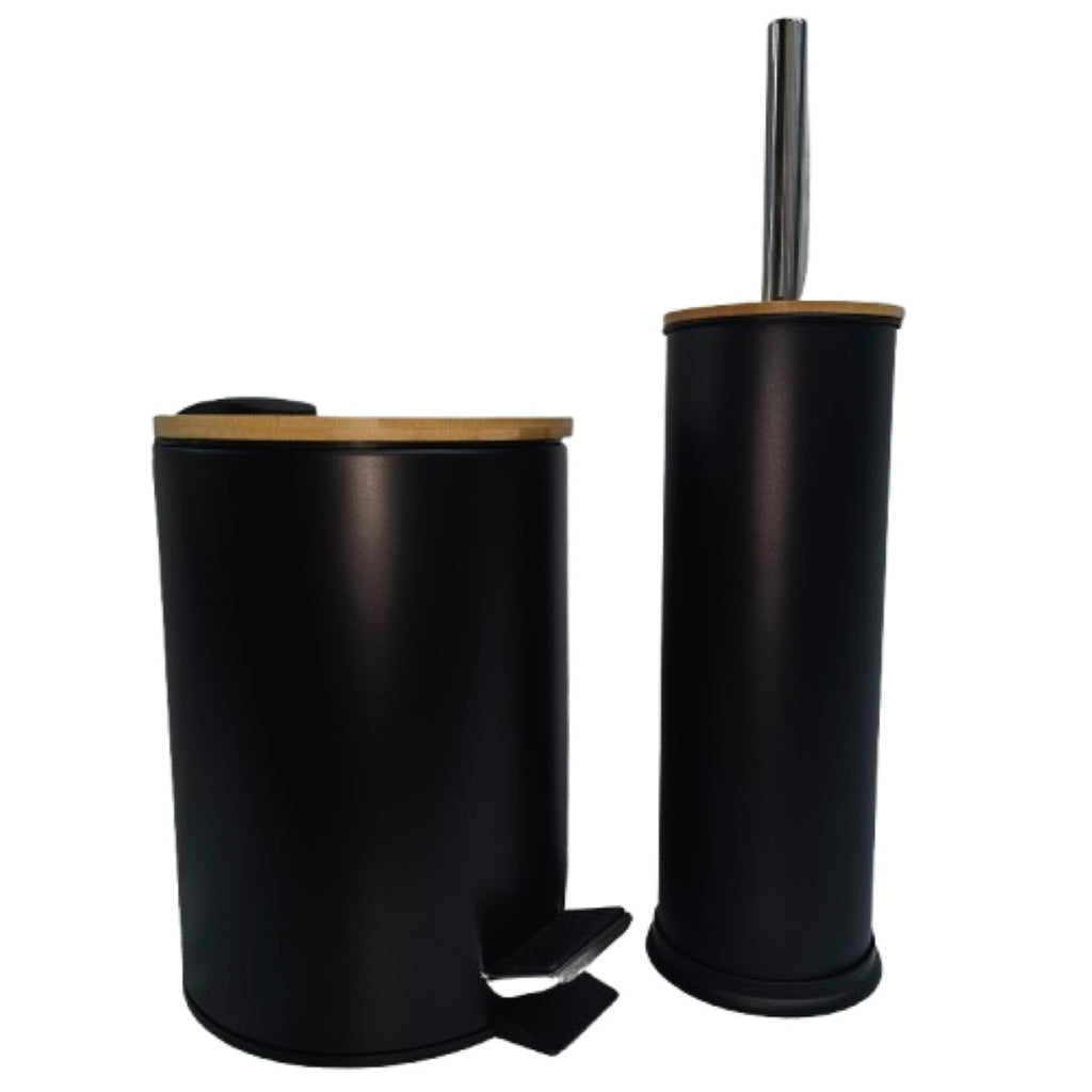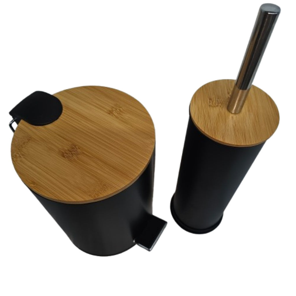 🌿🖤 KIT BANHEIRO REDONDO – Lixeira + Escova | Preto com Tampa de Bambu Inox 🖤🌿