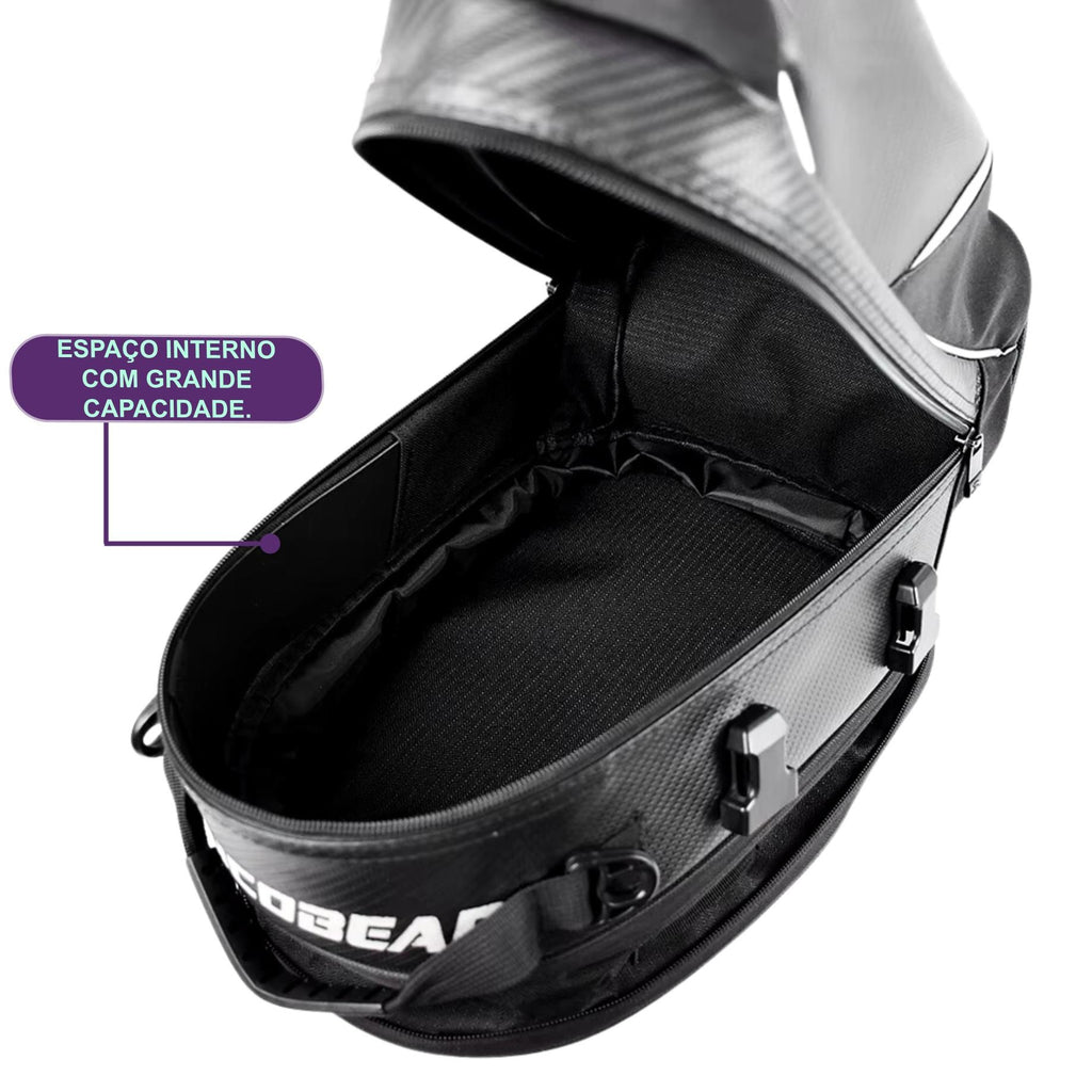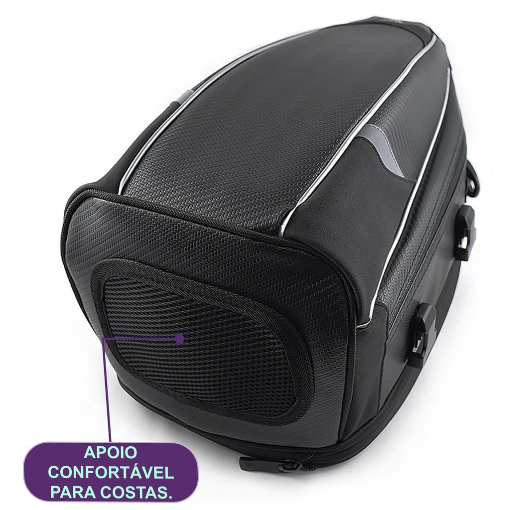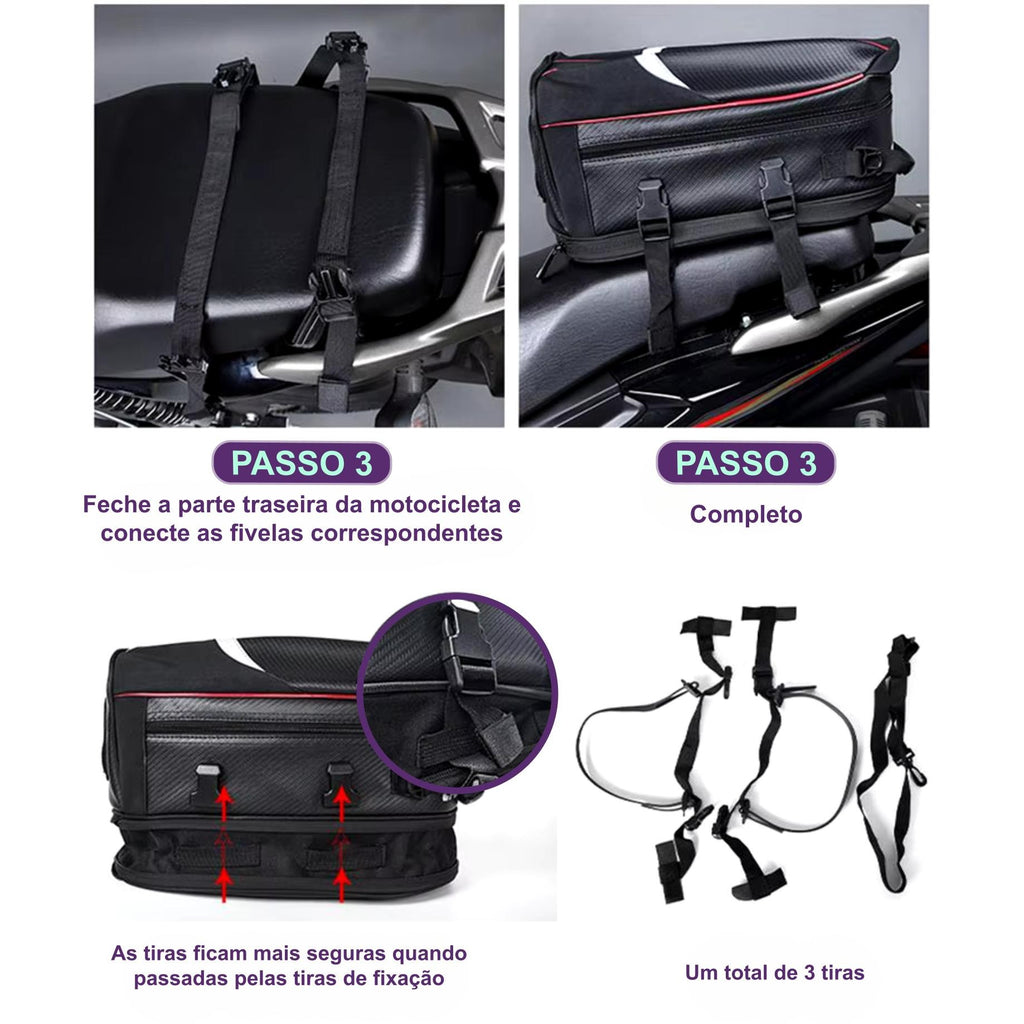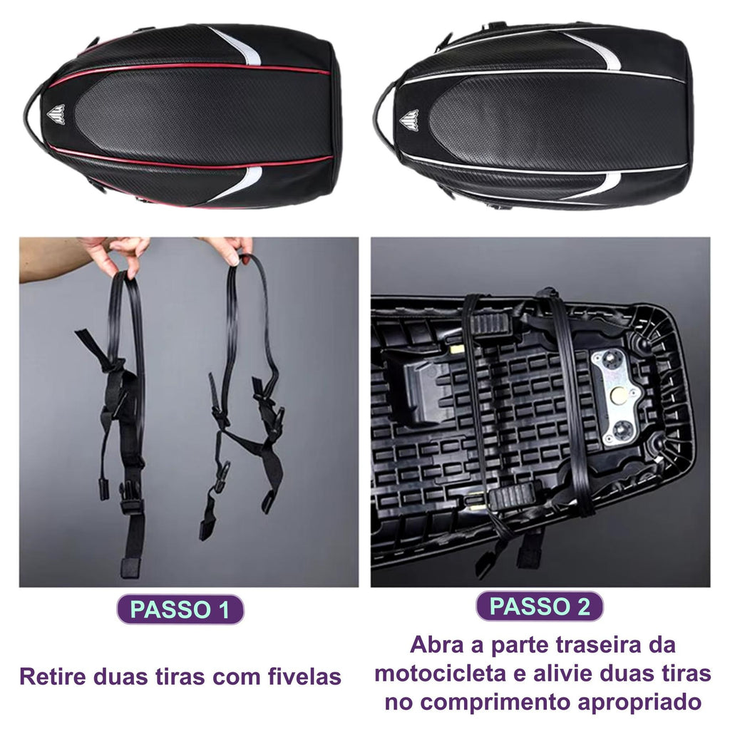 Ela oferece uma grande capacidade interna, com espaço suficiente para armazenar, luvas, roupas e até mesmo itens pessoais, como carteira, celular e ferramentas anti-roubo — tudo o que você precisa para o dia a dia ou para longas viagens. Projetada para encaixe universal, a bolsa mochila se adapta a diversos modelos de motos, e sua instalação é simples, bastando ajustar as alças de fixação para garantir estabilidade e segurança.