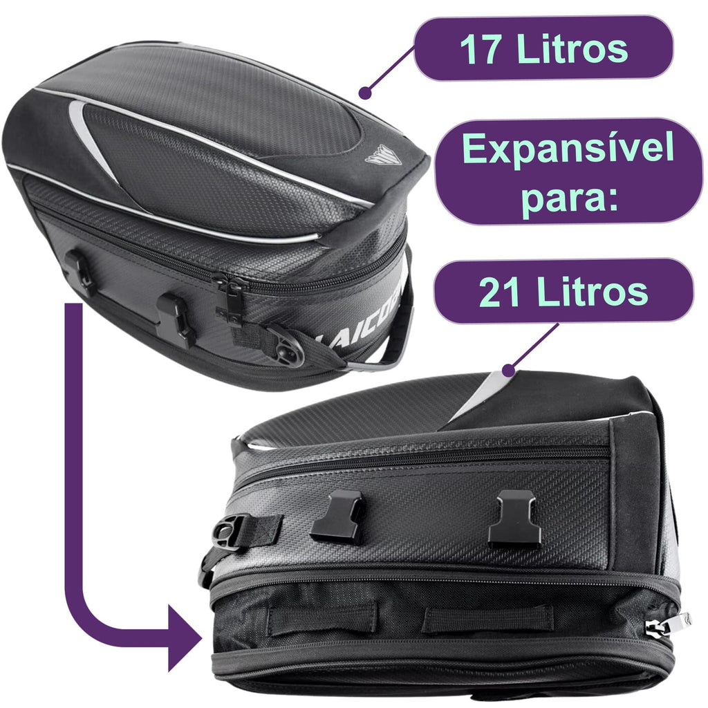 Capacidade de Volume: Comprimido: 370 x 190 x 200 mm, 17L / Expandido: 370 x 230 x 200 mm, 21L
