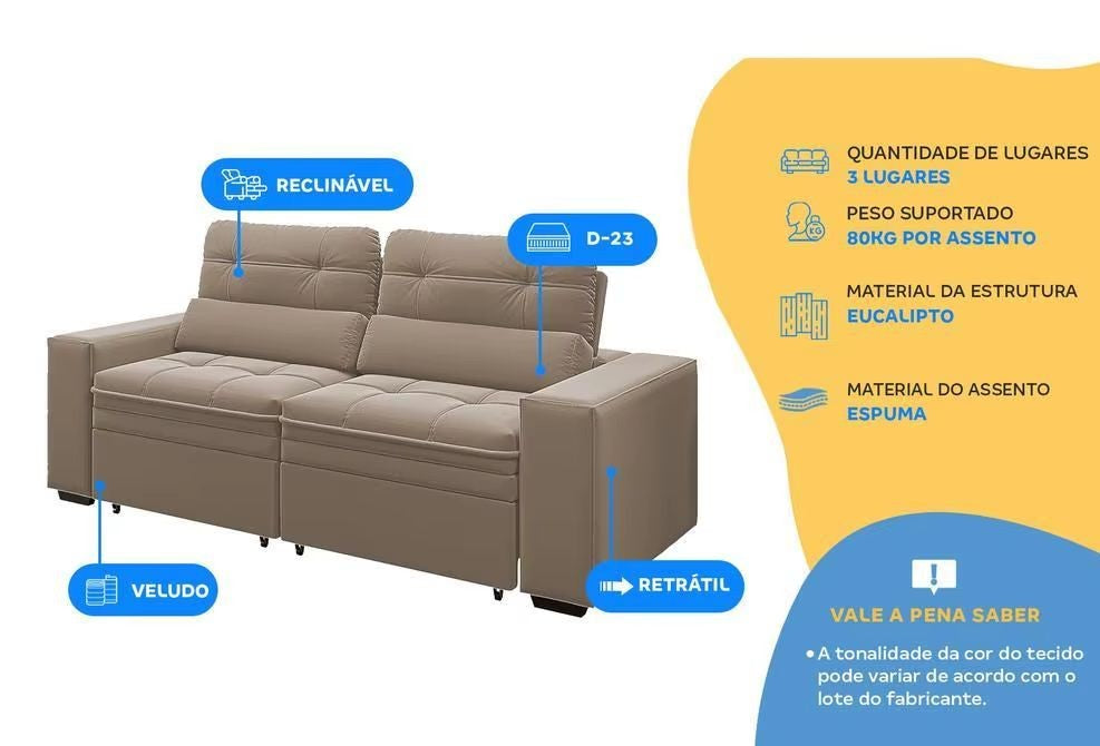 O revestimento é em tecido veludo proporciona delicadeza ao toque, o assento com espuma D-23 garante maior conforto, o preenchimento do encosto e braços em fibra faz deste produto sinônimo de sofisticação e beleza. Para completar ele conta com baú para guardar objetos e poupar espaço. Assistir um bom filme na sala não será mais como antes.