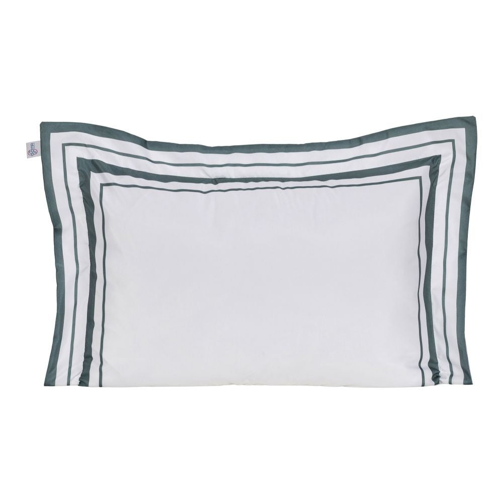 A fronha possui um debrum estampado, adicionando um acabamento elegante, enquanto a capa de almofada conta com debrum em todos os lados e fechamento em zíper para mais praticidade. O edredom é costurado nas bordas, garantindo que a manta interna fique sempre no lugar, mesmo após o uso.
