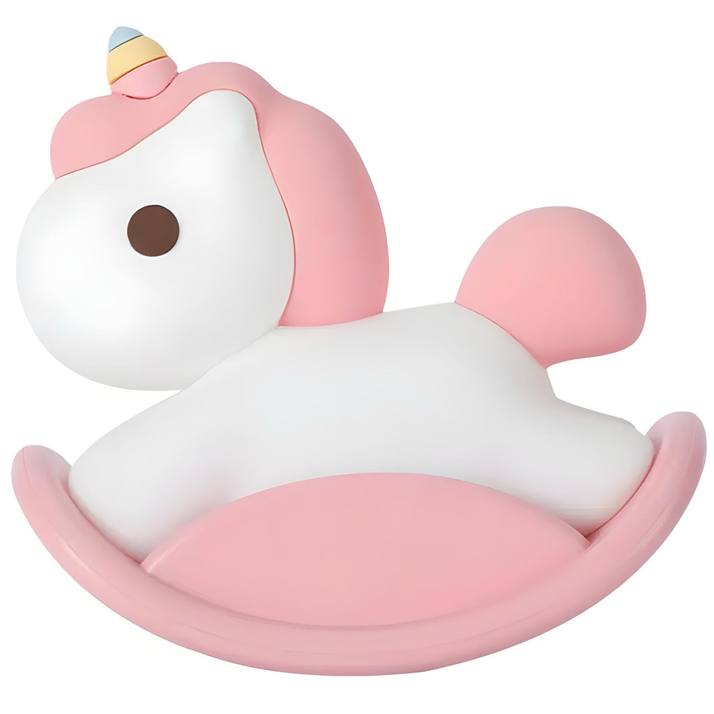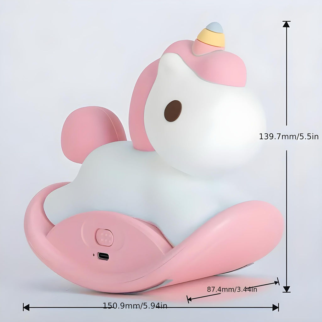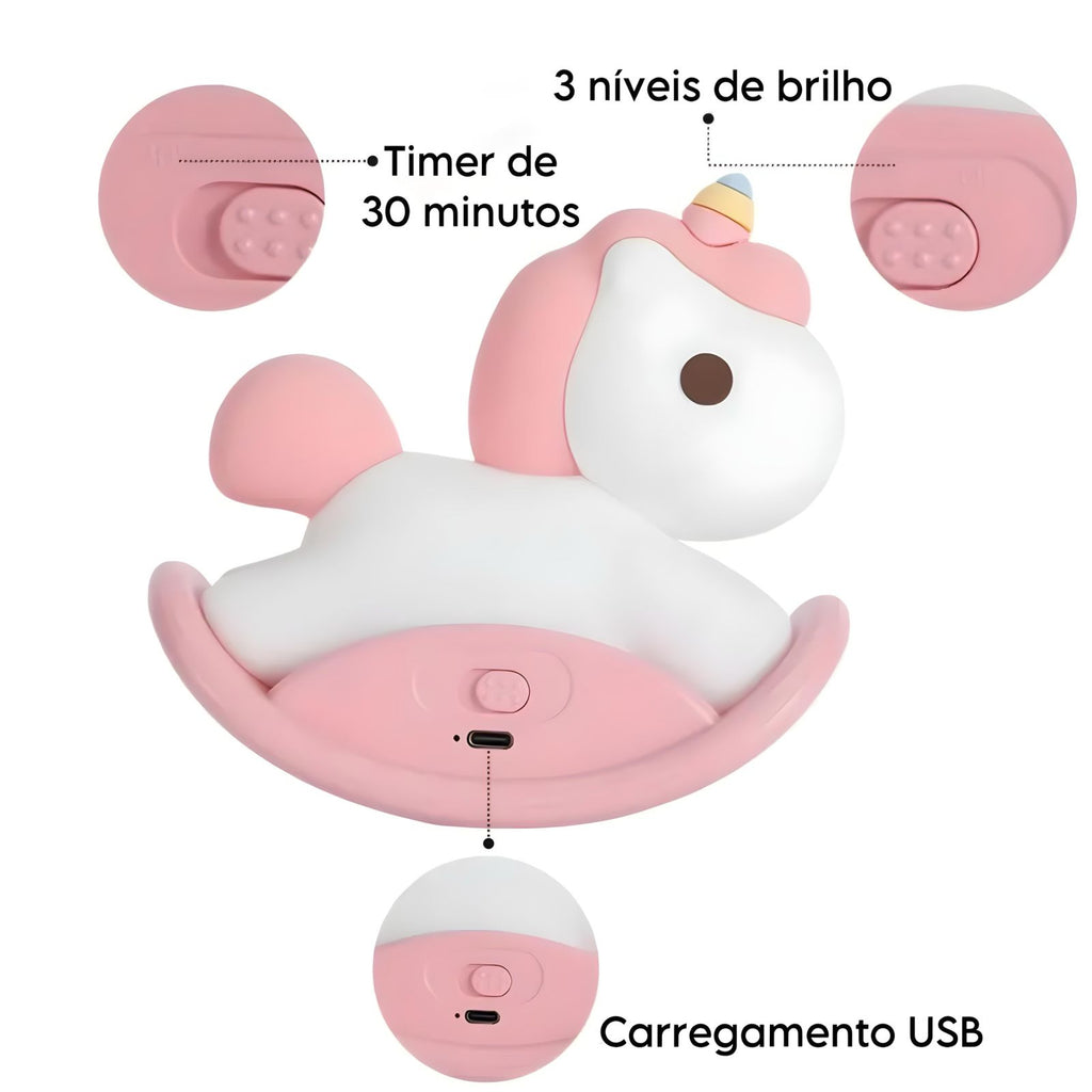 Deixe o momento de dormir mais tranquilo e aconchegante com essa linda luminária siliconada em formato de unicórnio. O produto possui 3 intensidades de luz, timer programado de 30 minutos e uma base em plástico que permite o balanço do mesmo. Feita com materiais macios e seguros, é o item perfeito para decorar o quarto dos pequenos!