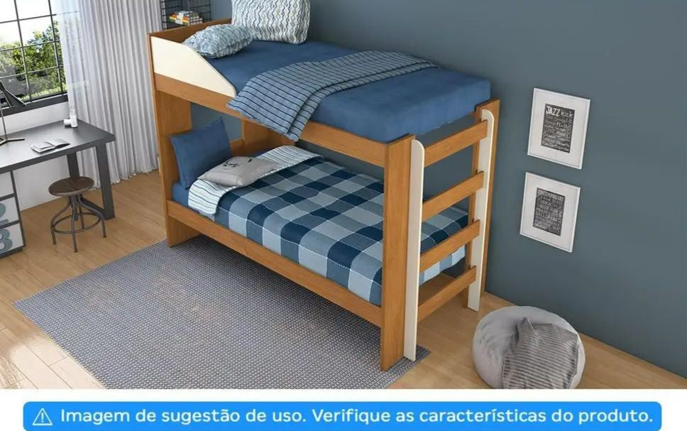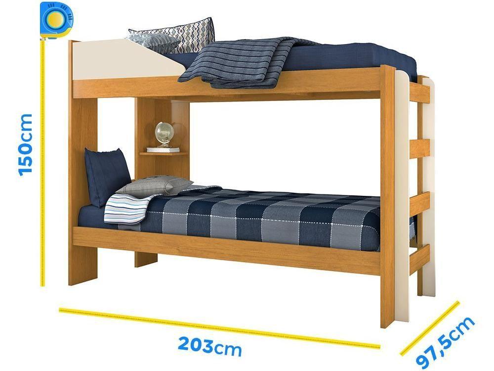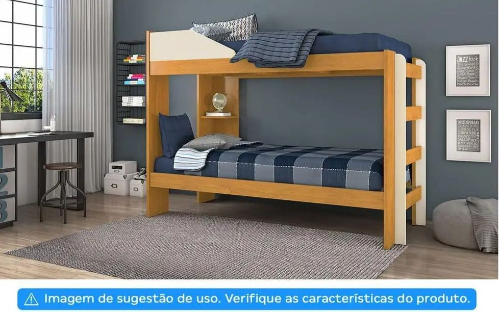 Na cama inferior da beliche, tem a presença de uma prateleira interna, sendo uma ótima opção para uma luz de leitura. Seu Estrado é confeccionado com travessas de eucalipto e ripas de MDF. A pintura em tinta ultravioleta de alta resistência e durabilidade com acabamento em verniz brilhante na cores cinamomo e off white, recobrem e protegem todo o produto.