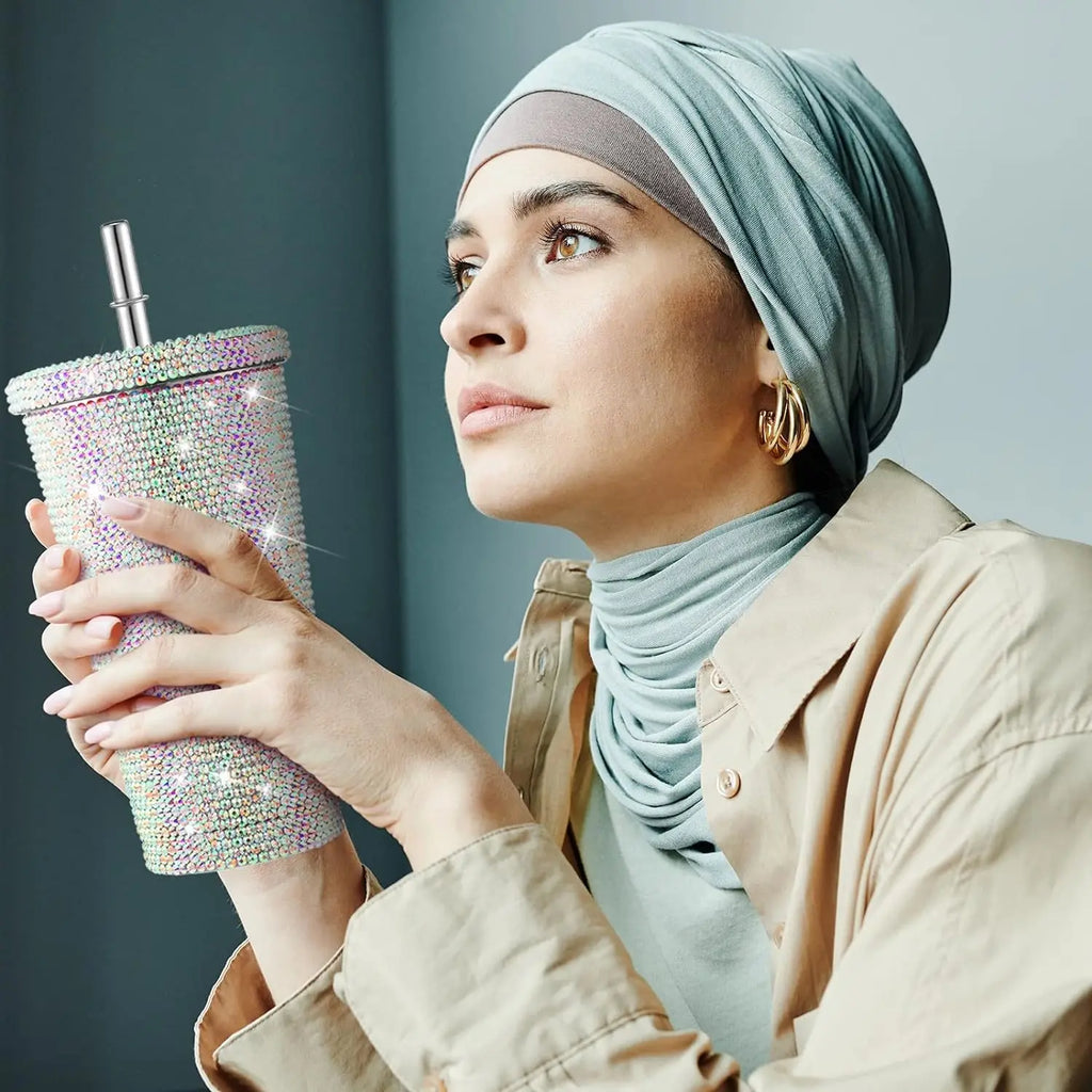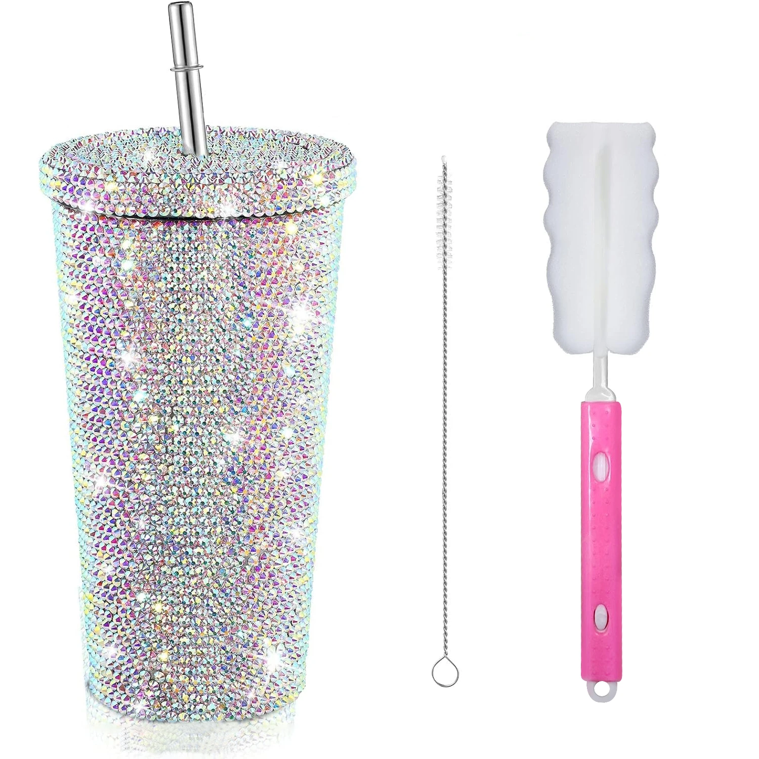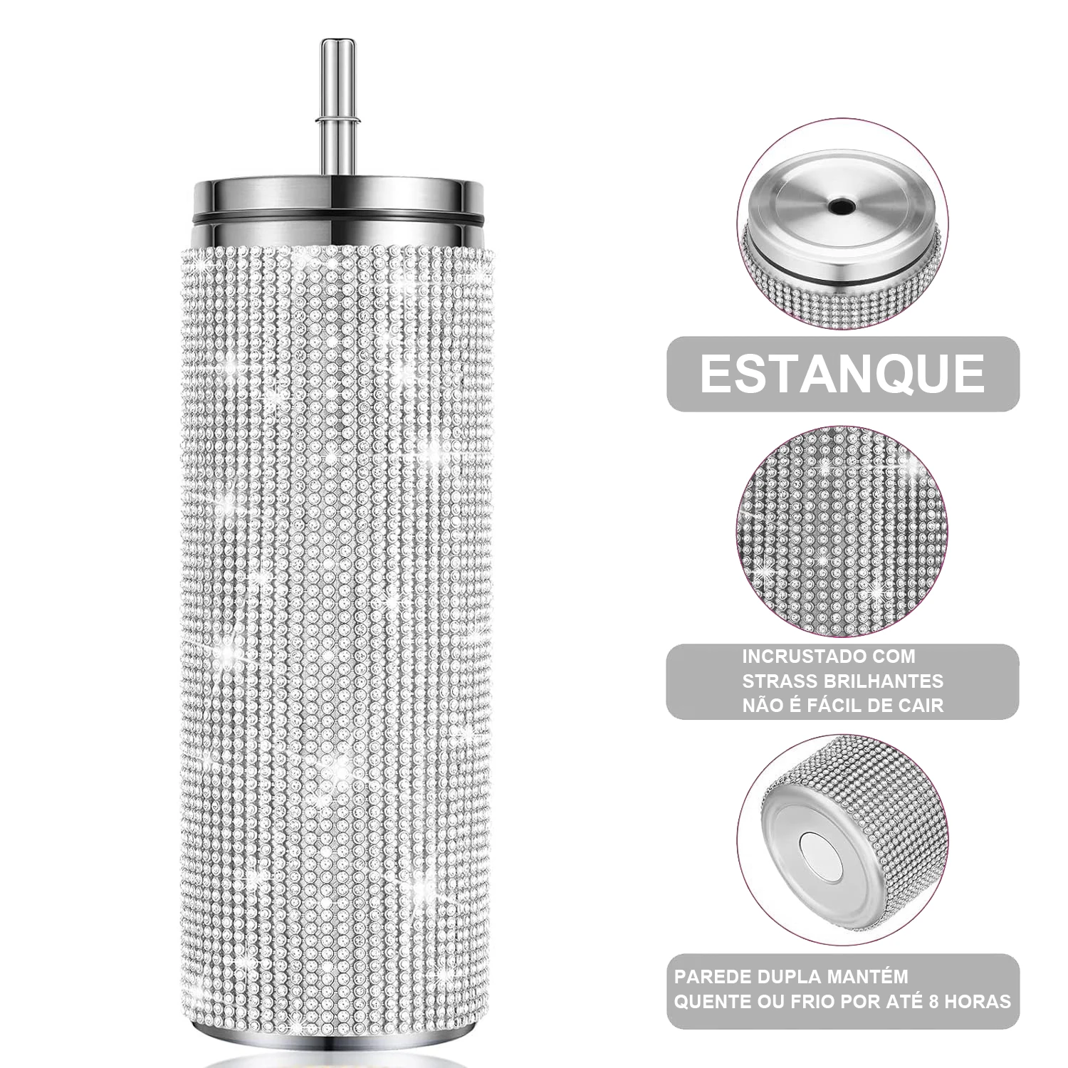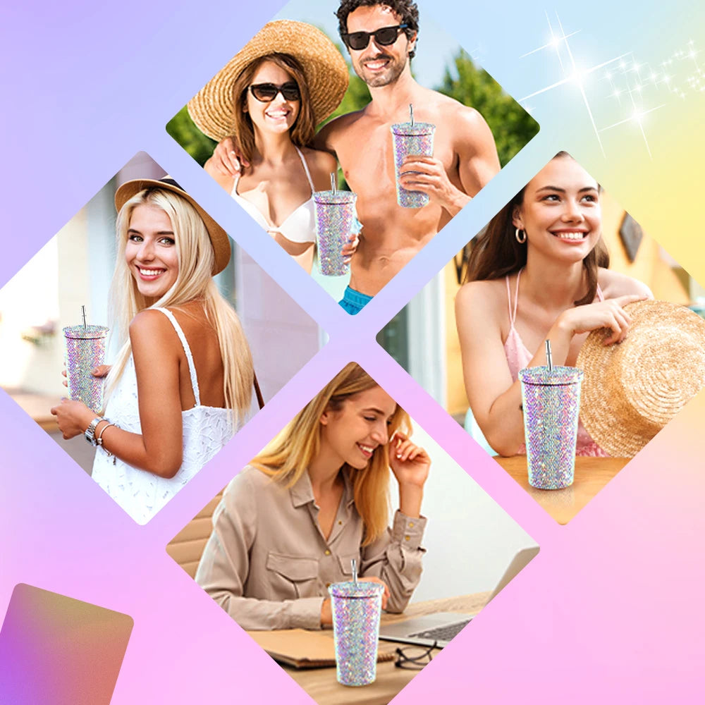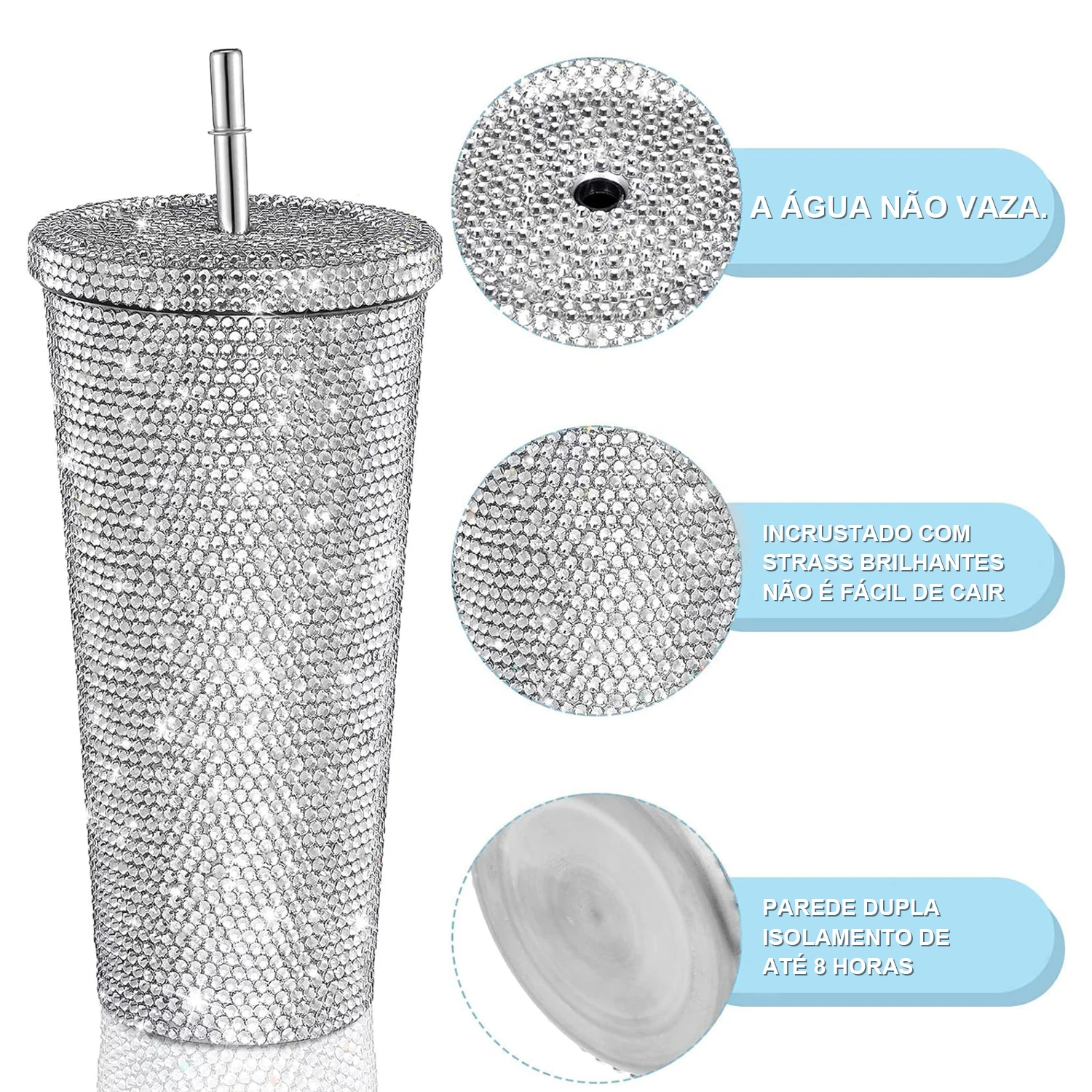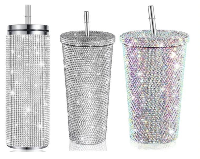 O copo com strass é feito de aço inoxidável 304 para um belo acabamento. Os strass são fixados nos copos de strass com um adesivo ecológico de alta viscosidade que é forte e resistente a descascamento.