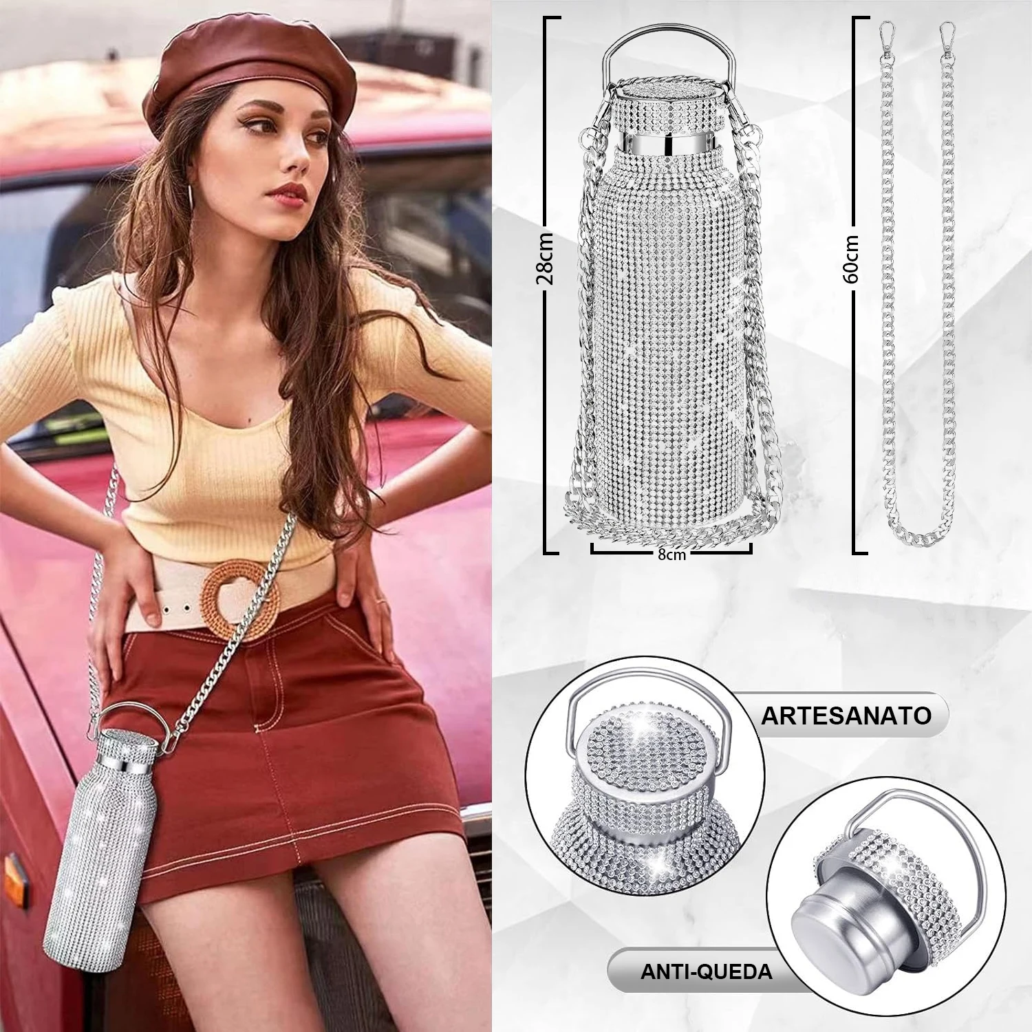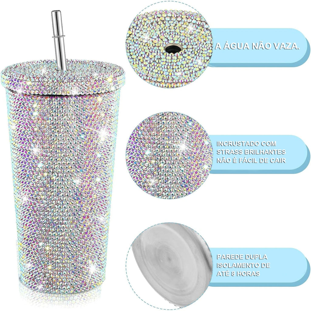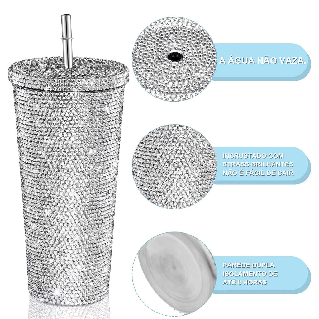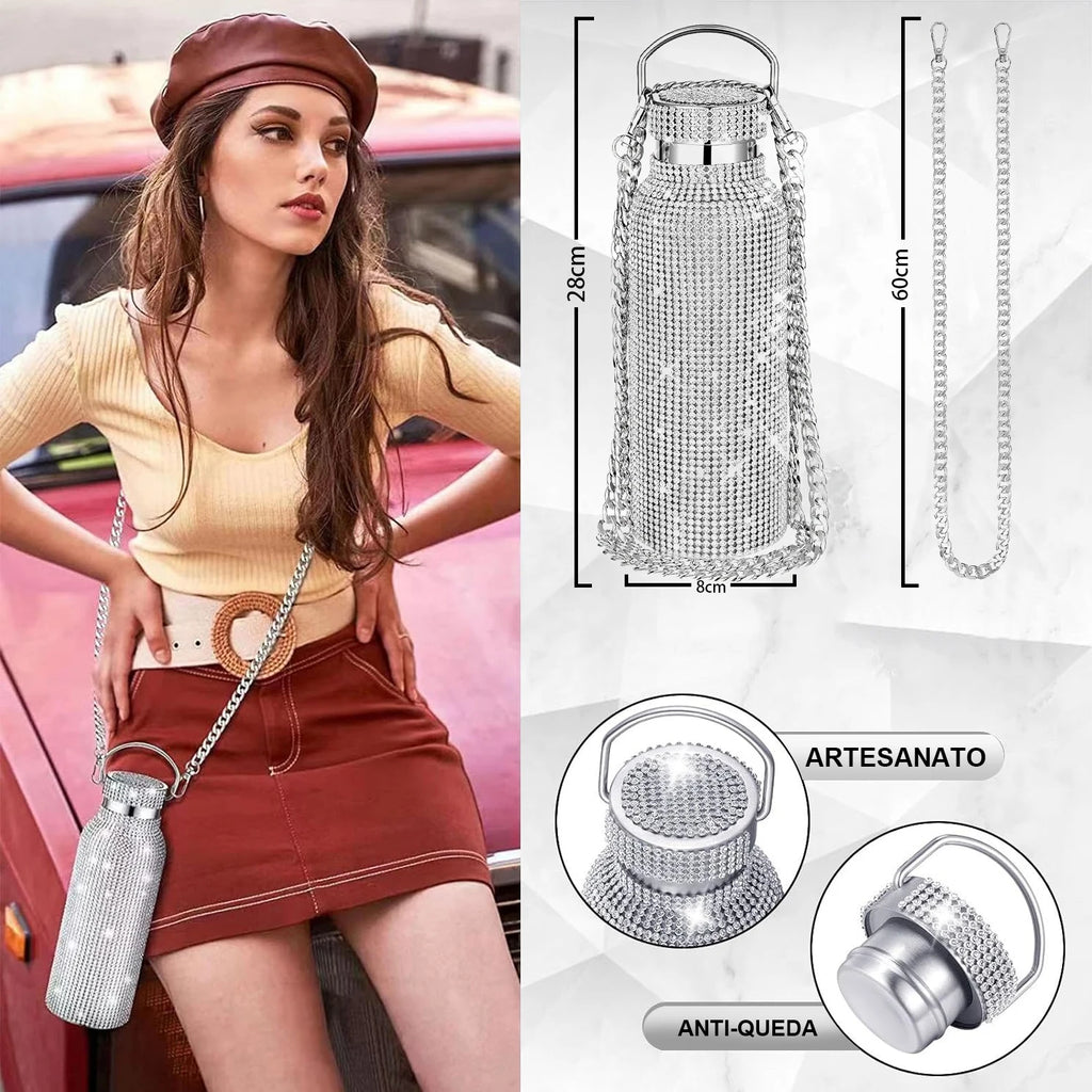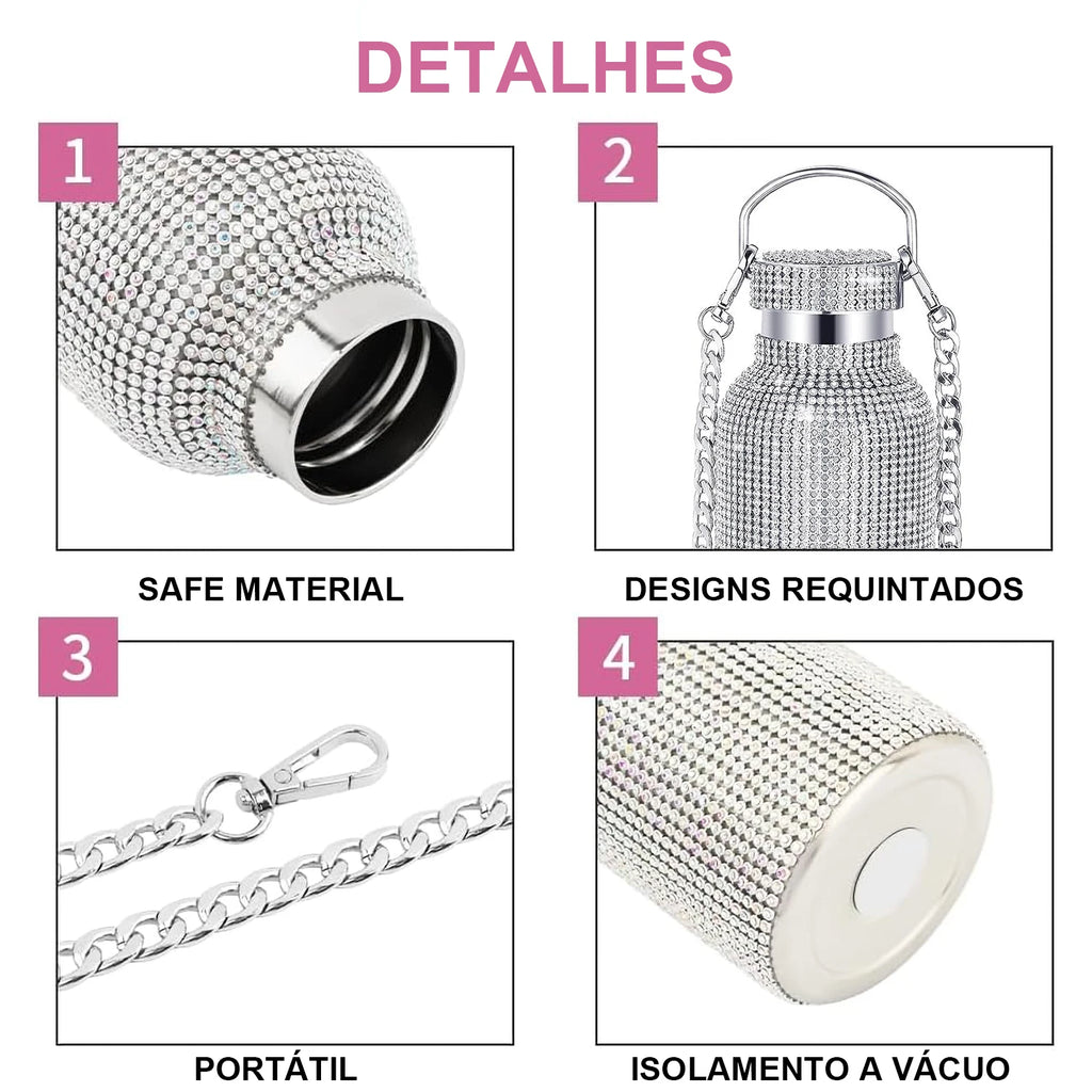O frasco Bling tem um belo acabamento com strass e é bem isolado para manter as bebidas quentes ou frias durante todo o dia.