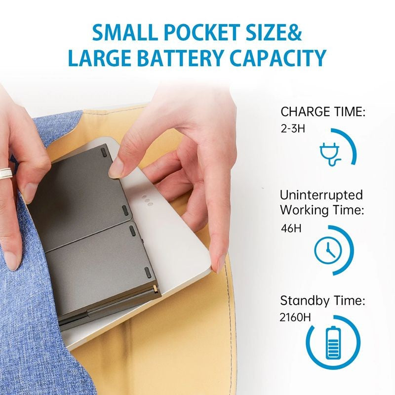 O tablet teclado possui uma bateria de lítio recarregável de grande capacidade de 140mAh embutida, que tem um longo tempo de espera e é ecologicamente correta.Após 10 minutos sem trabalho, ele entrará no estado de suspensão inteligente, economizando energia e energia para você, podendo acordar pressionando qualquer tecla.