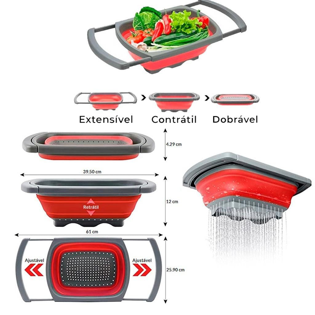 - Escorredor para Alimentos Retrátil - Medidas: - Fechado - 39cm x 26cm x 4,5cm - Aberto e Expandido - 59cm x 26cm x 11cm - Material: Polipropeno e Borracha Termoplástica - Peso: 0,500kg - Uso: Utilize-o na hora de escorrer o macarrão, lavar o arroz, feijão, legumes e verduras, utilize as hastes laterais para apoiar o escorredor na pia e deixar suas mãos livres. - Aguenta temperaturas de -40°C até 220°C - Super Prático, dobrável, ocupa pouco espaço. Estamos sempre à disposição para tirar qualquer dúvida, entre em contato por whatsapp ok? Agradecemos a preferência.
