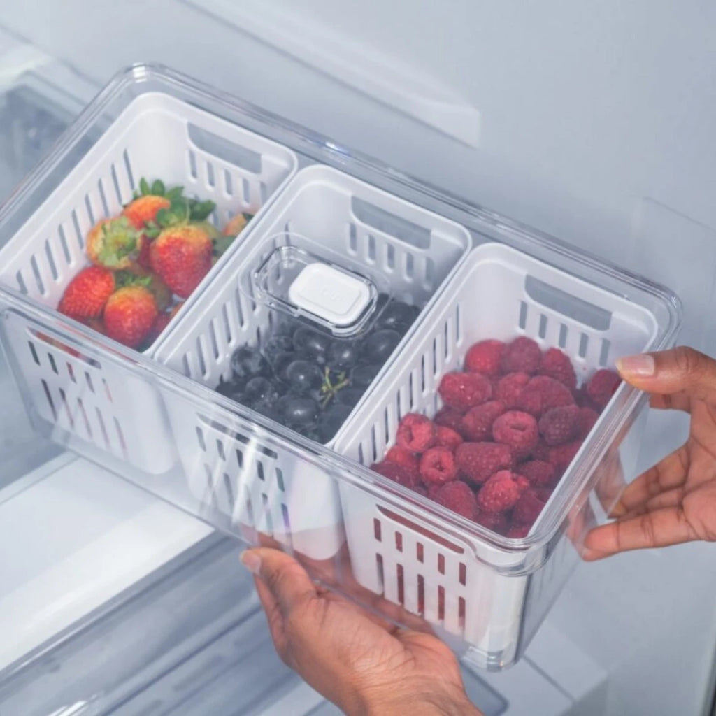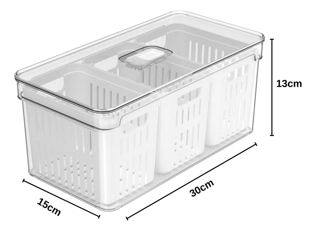 O organizador de geladeira possui capacidade de 5L e conta com 3 cestos para manter alimentos, frutas e verduras organizados. O sistema de armazenamento evita que as frutas, verduras e alimentos fiquem molhados, desta forma, tendo uma maior durabilidade.