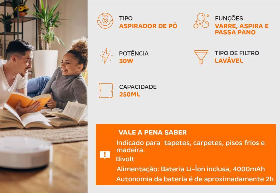 Robô Aspirador ROBOT : otimiza seu tempo para uma casa sempre limpa. A duração da bateria pode variar dependendo da área, superfície, ciclos de operação e nível de sucção.