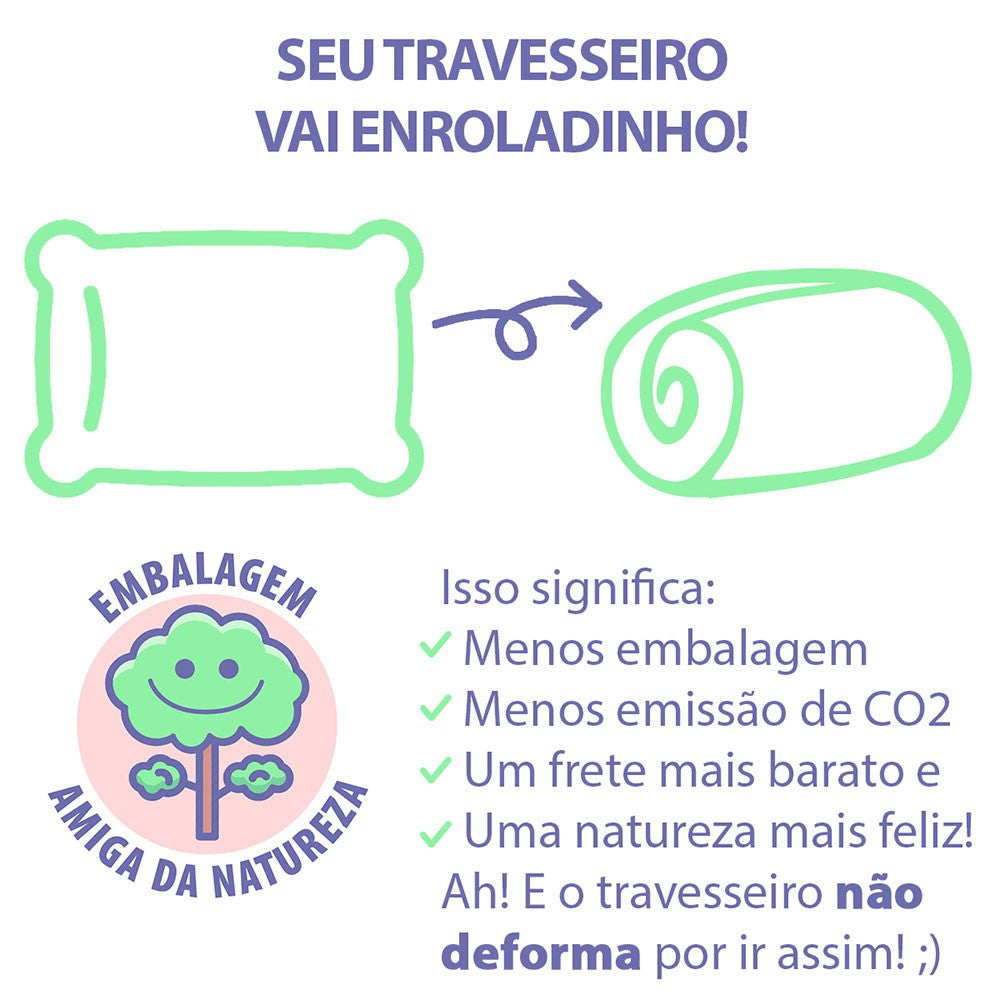 Pensando na sustentabilidade, enviamos seu travesseiro enroladinho. É usado menos embalagens e não ocupa espaço no caminhão, que consequentemente diminui a emissão de CO2, polui menos e o frete sai bem mais barato. A natureza agradece né? Ah, e o travesseiro não deforma por ser embalado dessa forma, ok? Bons sonhos