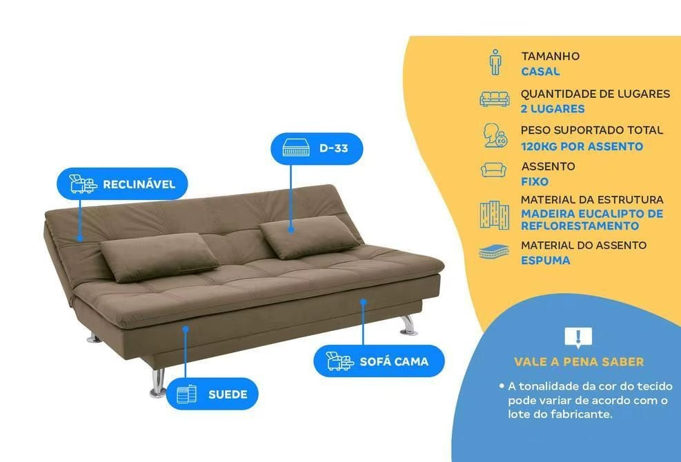 Para quem procura um móvel moderno, com qualidade, conforto e que seja um coringa para assistir um filme ou dormir, o Sofá Cama é a opção ideal para a sua casa. Ele possui encosto de espuma D23, reclinável com mecanismo de abertura em catraca, virando cama.