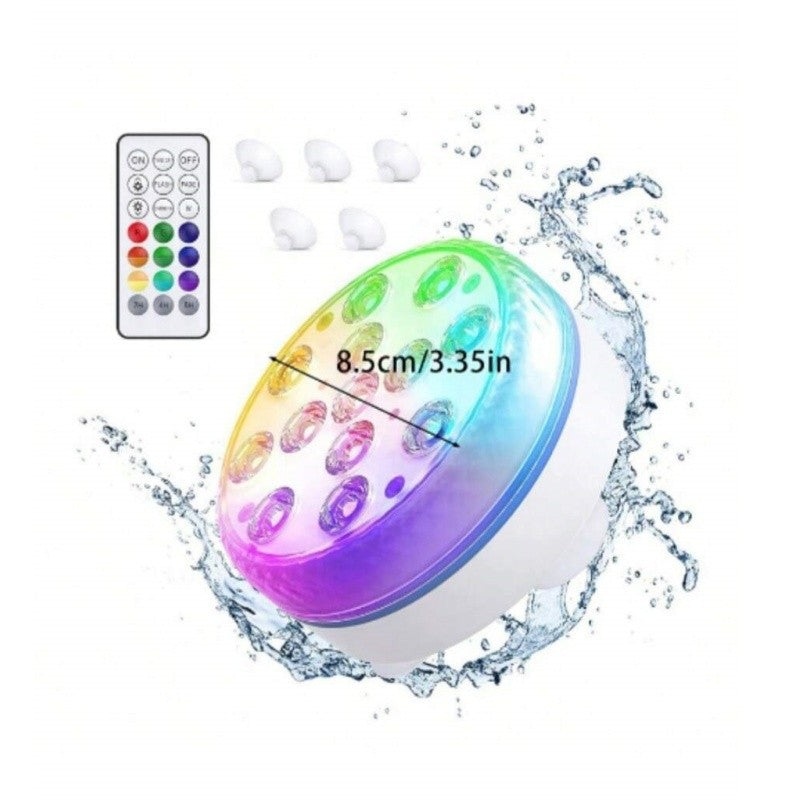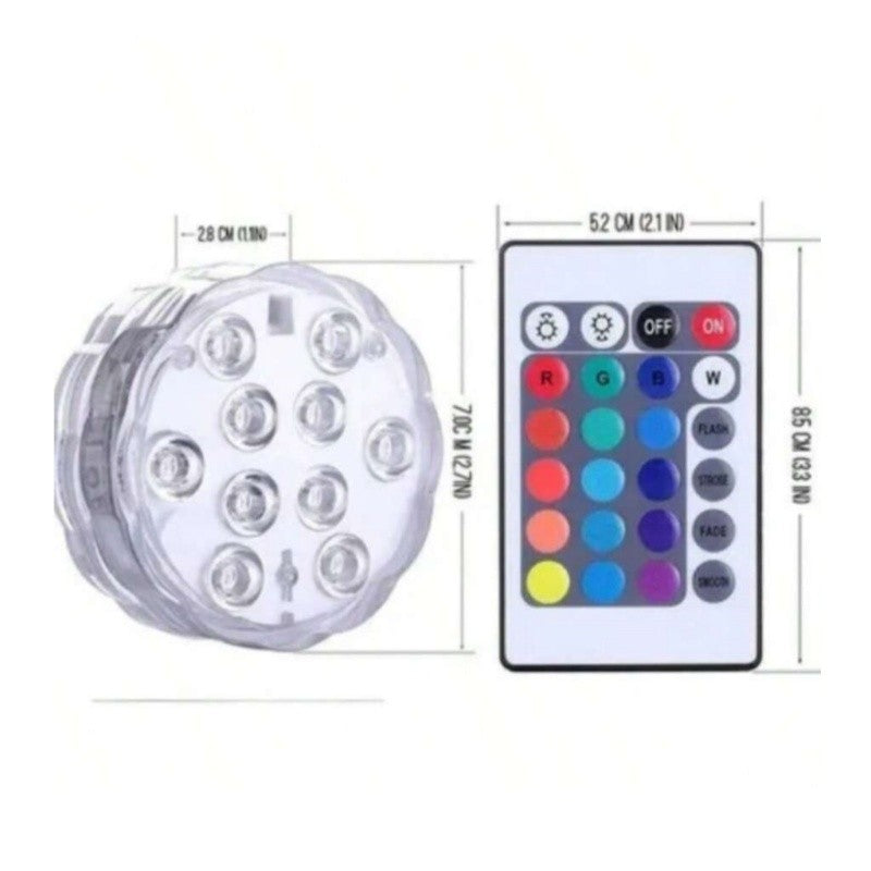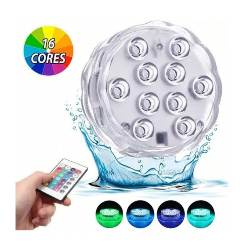 A Luminária de Piscina e Afins vem com a quantidade de 10 Leds RGB e é ideal para aquários, piscinas, decoração de festas, vasos ou qualquer recipiente cheio de água, por ser totalmente a prova d'água.