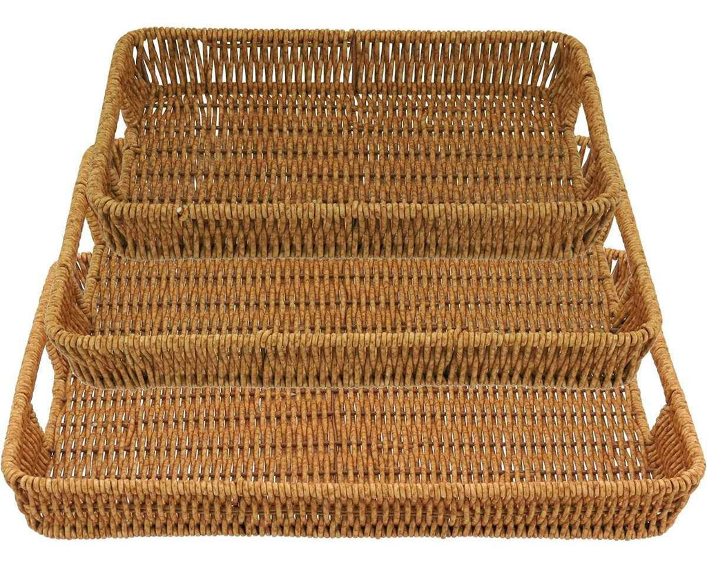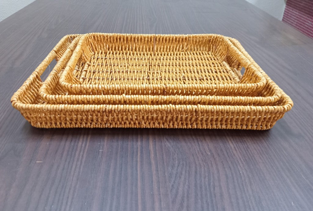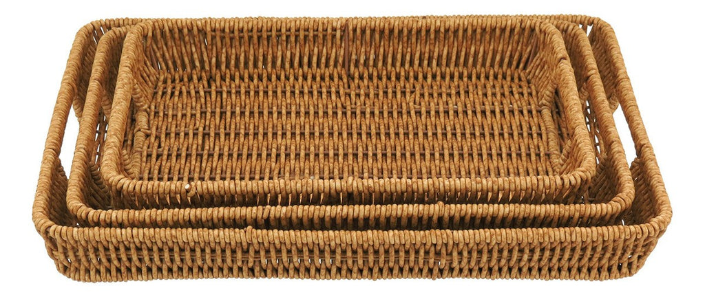 Adicione charme, funcionalidade e sofisticação à sua mesa com este conjunto de 3 bandejas decorativas em plástico com aparência natural. Perfeitas para servir com elegância ou decorar com estilo.