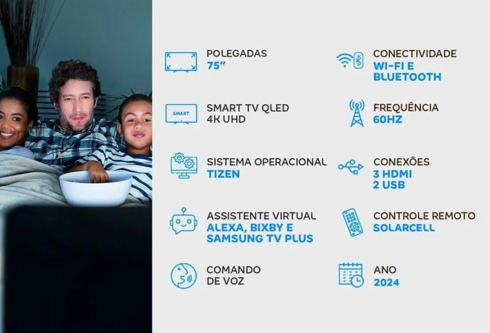 Conta com o sistema operacional Tizen, que oferece uma interface intuitiva e fácil de usar. A conectividade dela é outro ponto positivo. Conta com Wi-Fi e Bluetooth, permitindo conectar à internet e a outros dispositivos, como smartphones e tablets. A TV tem um design slim, com bordas finas, que deixam o visual mais clean e moderno.